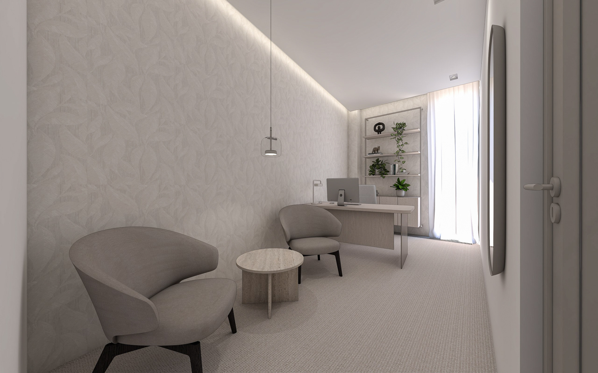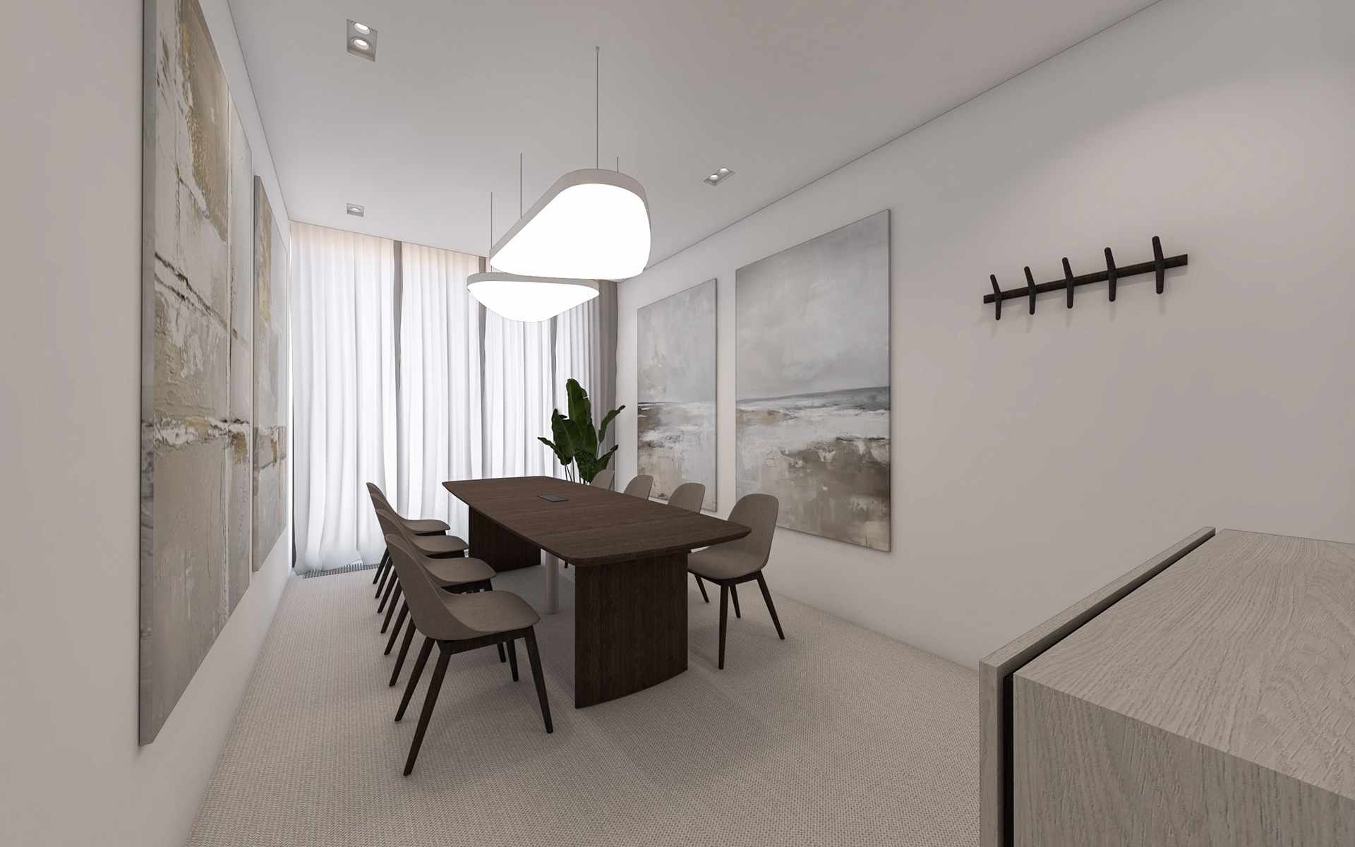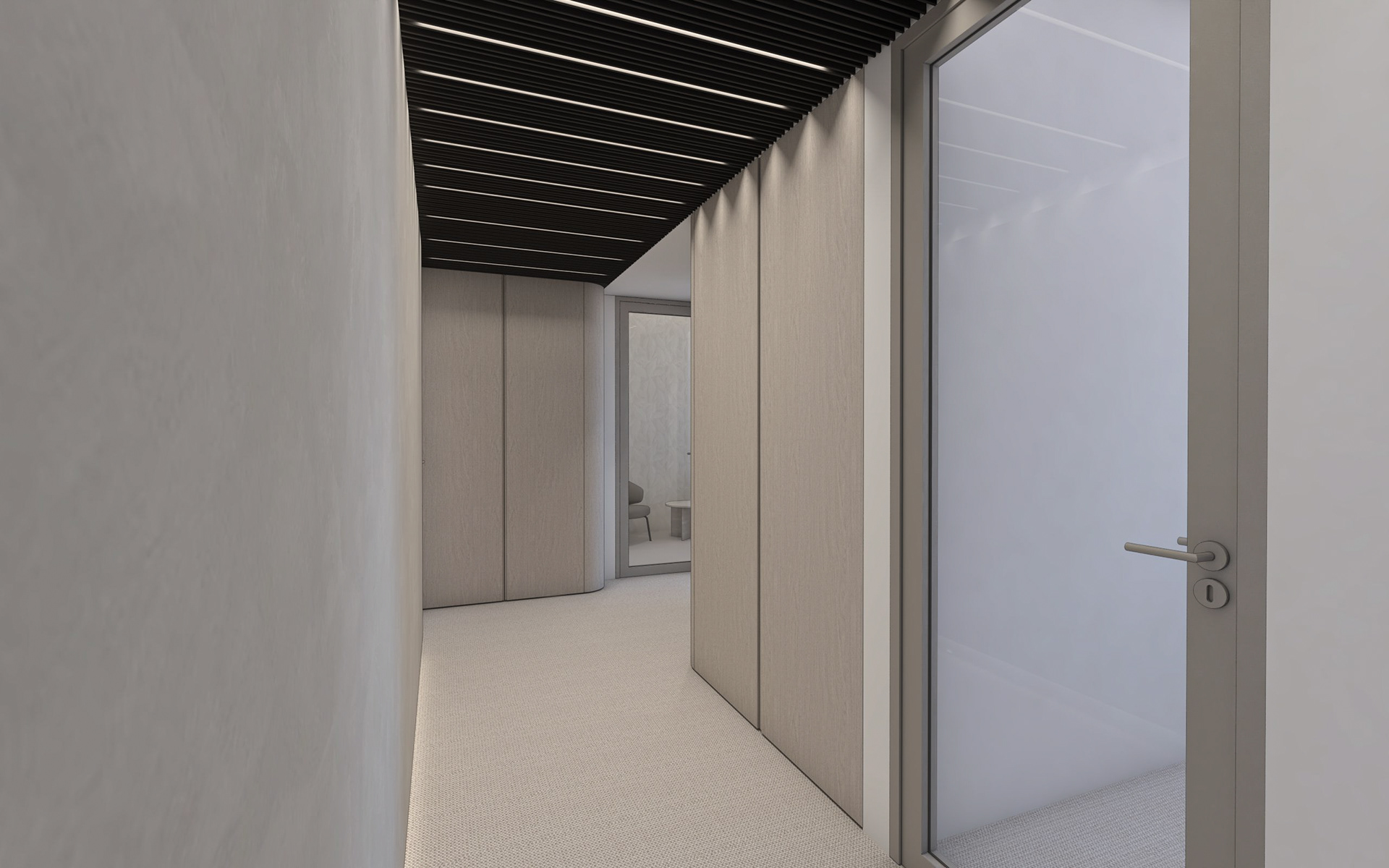 Interiéry navazující na vstupní lobby. Chodba, dvě zasedací místnosti pro prémiové klienty a kancelář ředitelky.