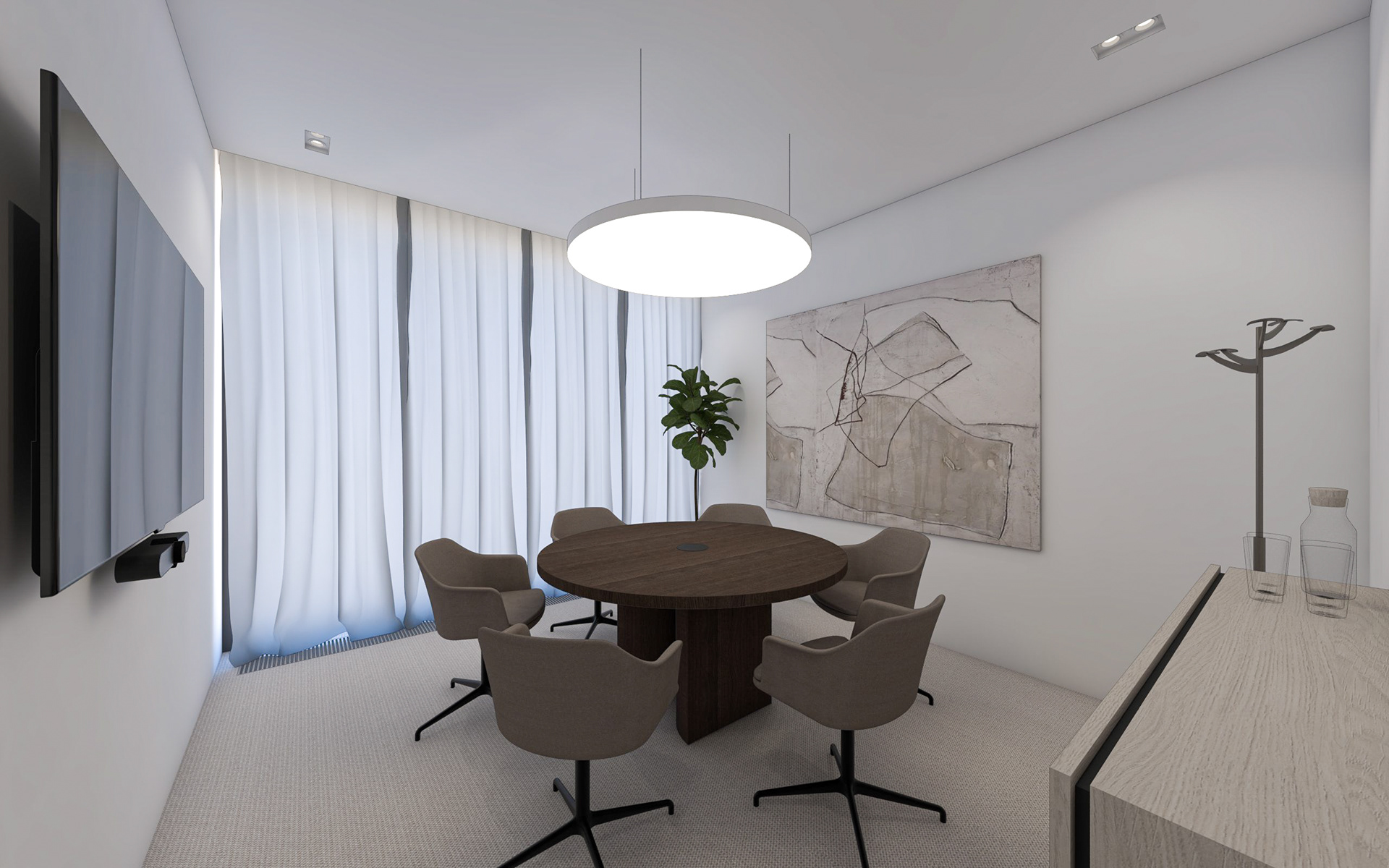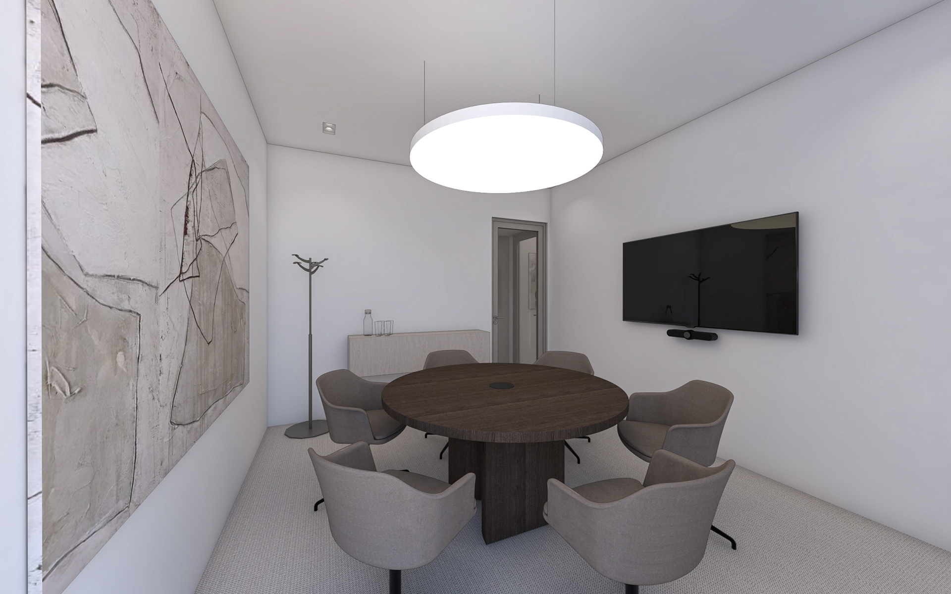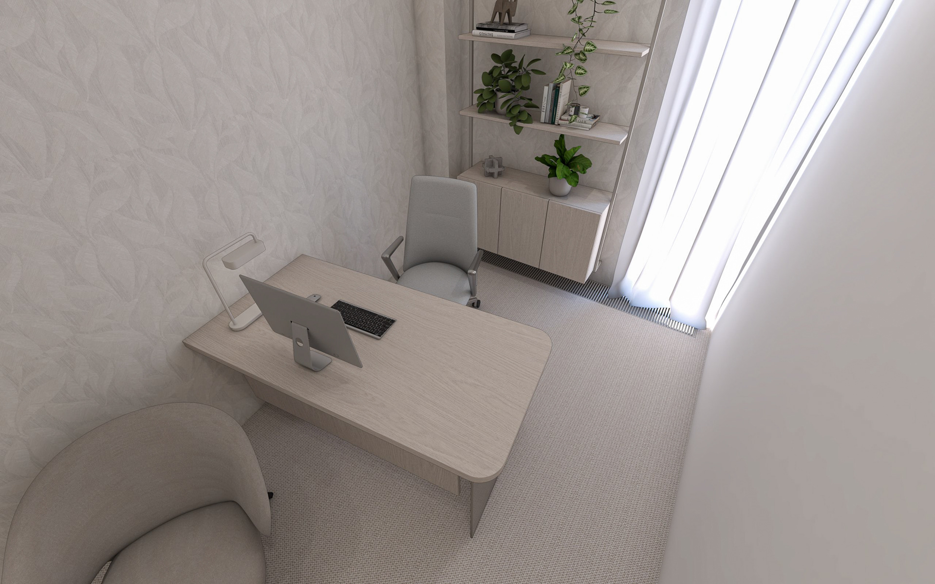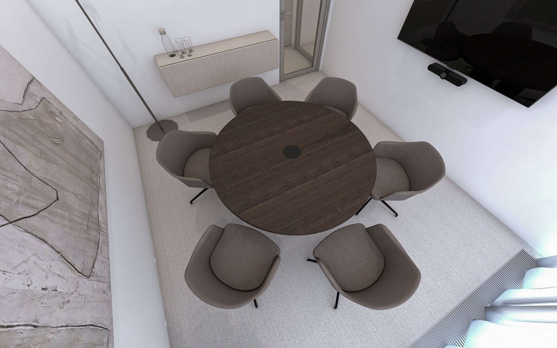 Interiéry navazující na vstupní lobby. Chodba, dvě zasedací místnosti pro prémiové klienty a kancelář ředitelky.