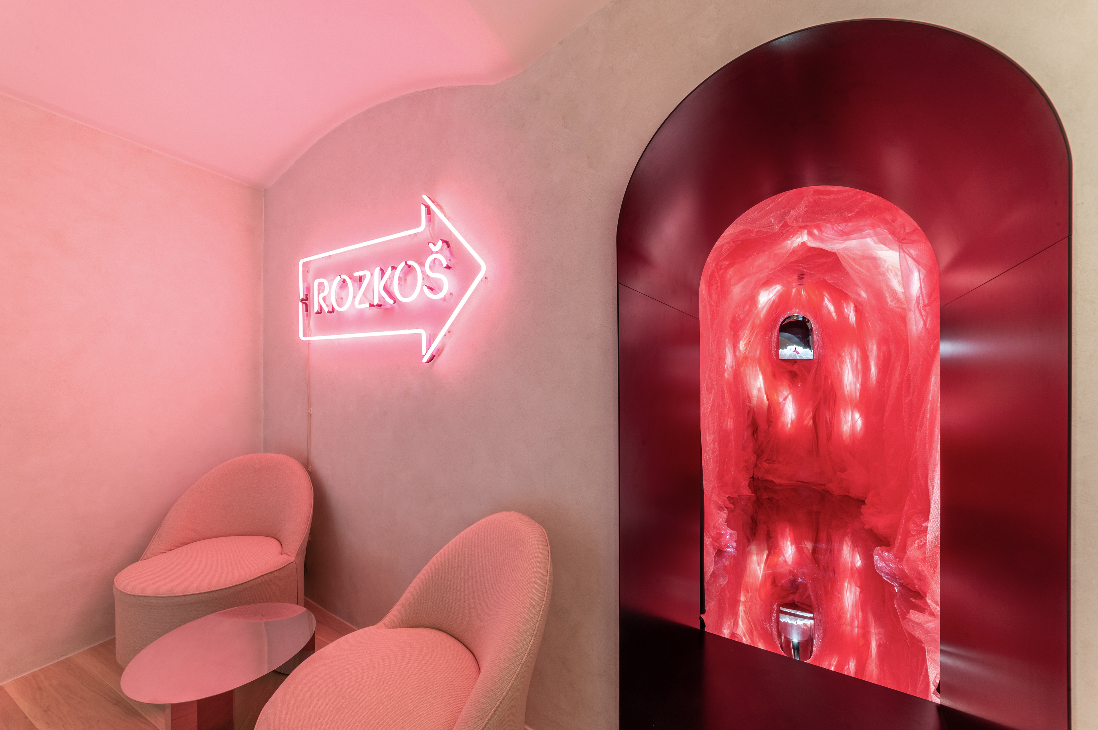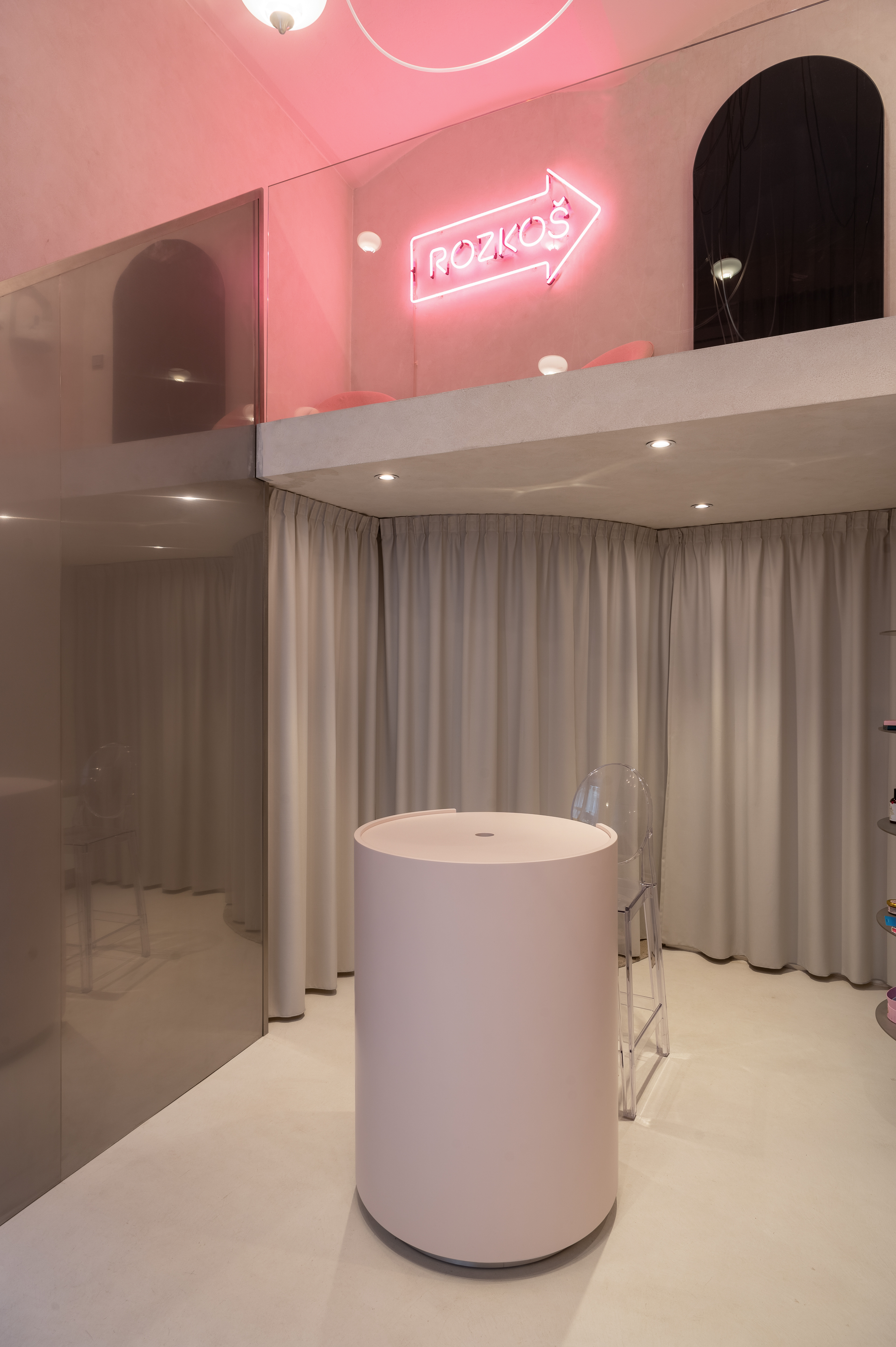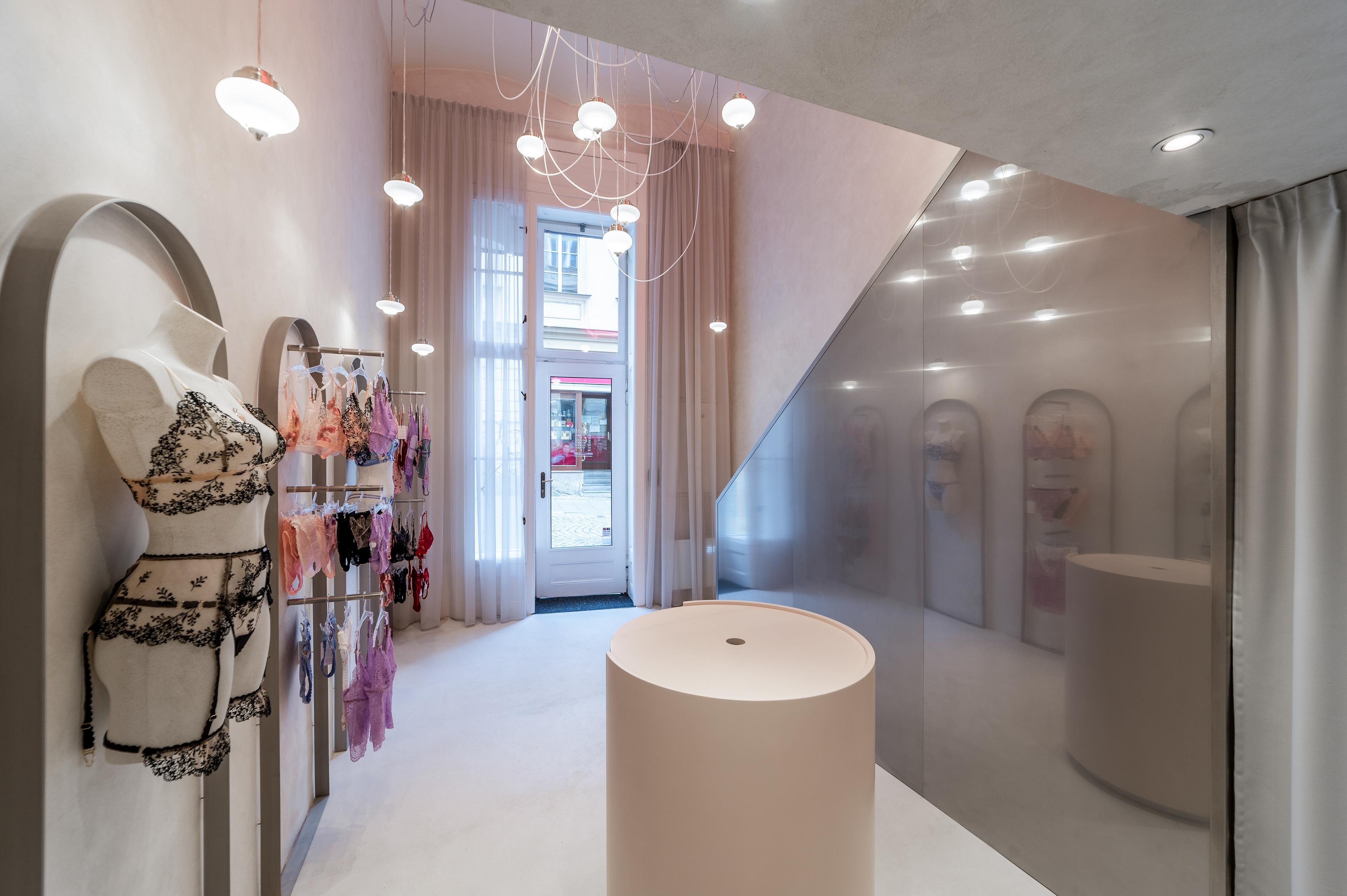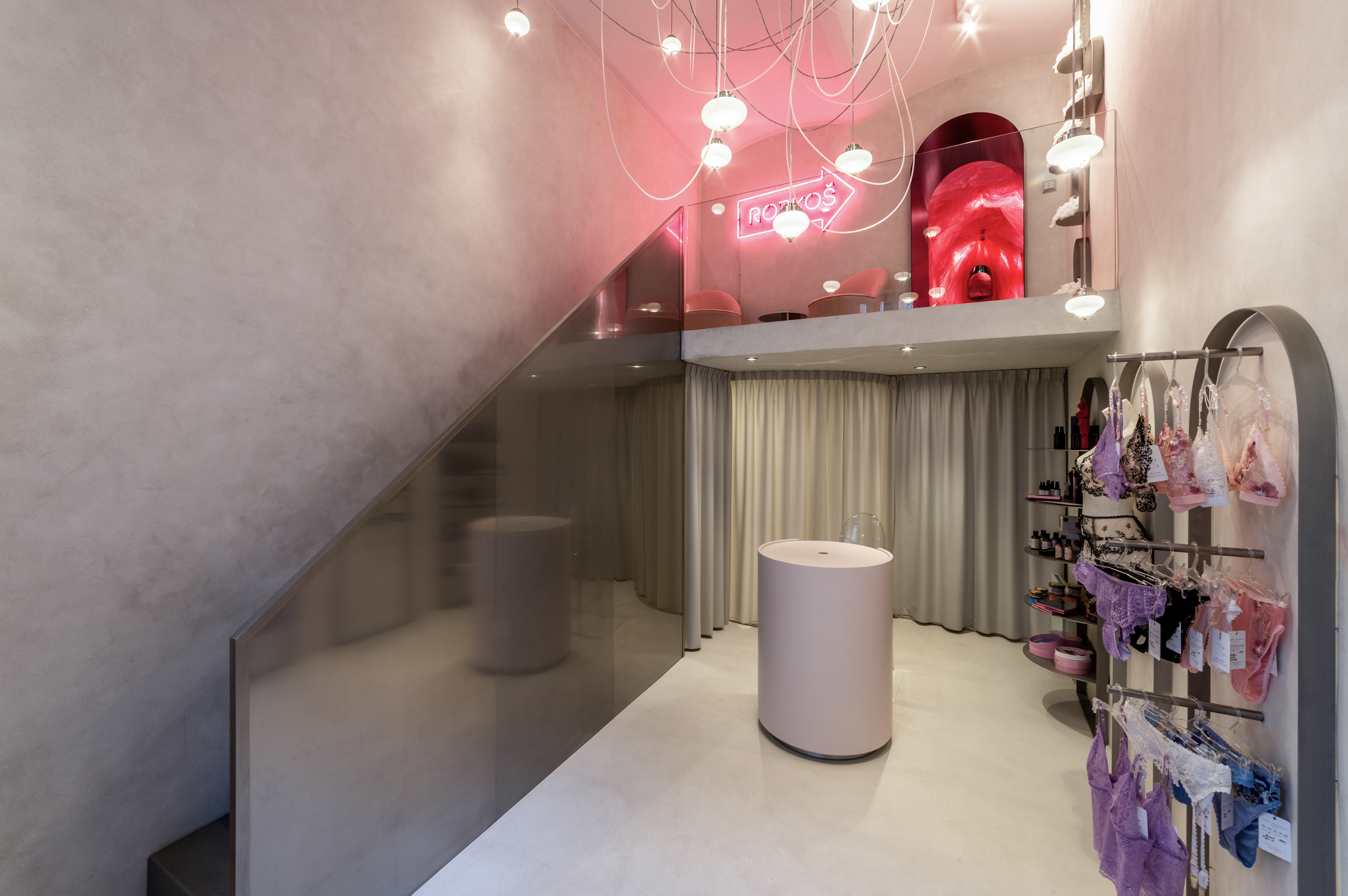 Interiér butiku s rozkoší. Lingerie, designové erotické hračky, hravost, intimita. Vkusný interiér s překvapením.