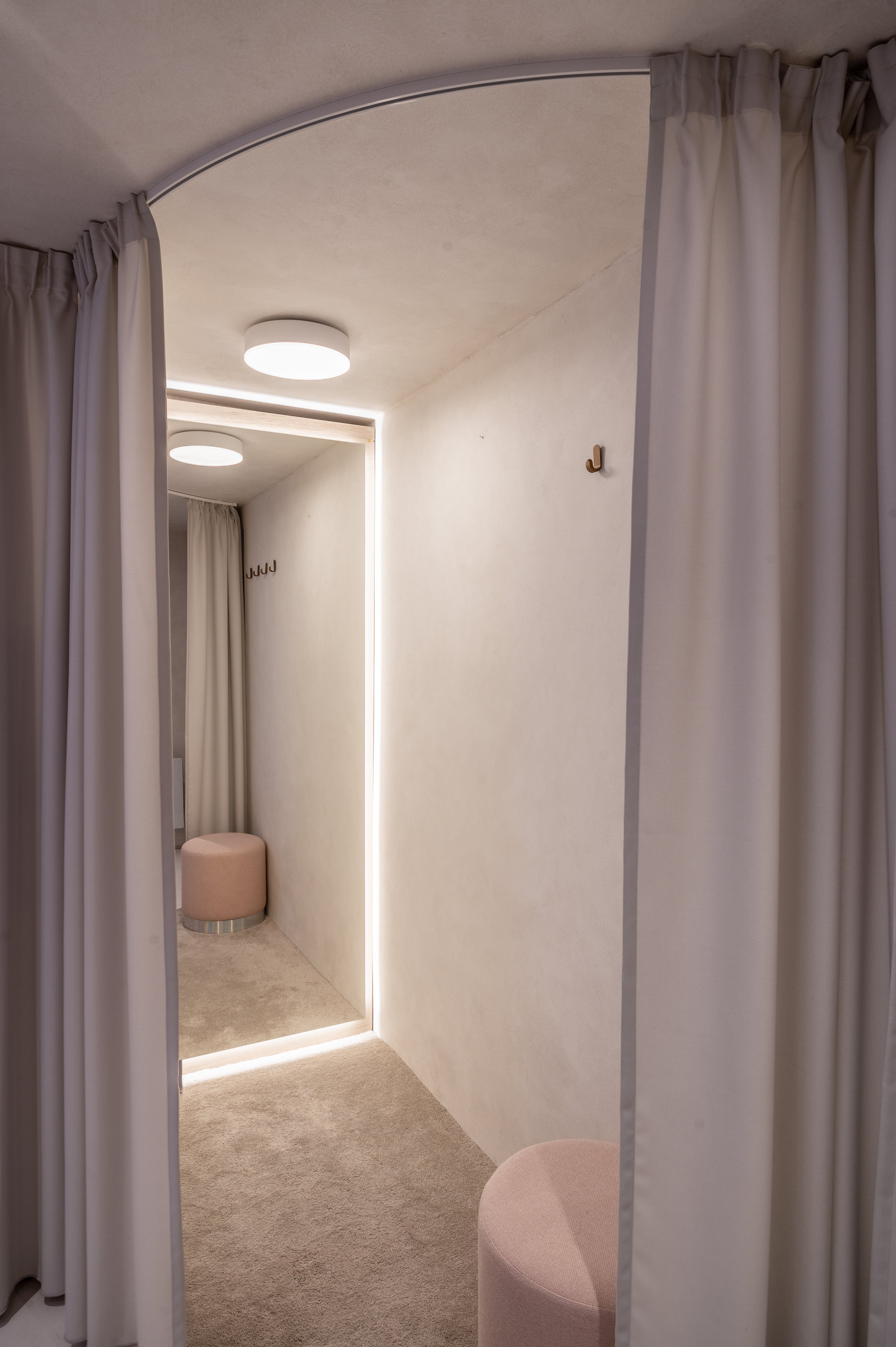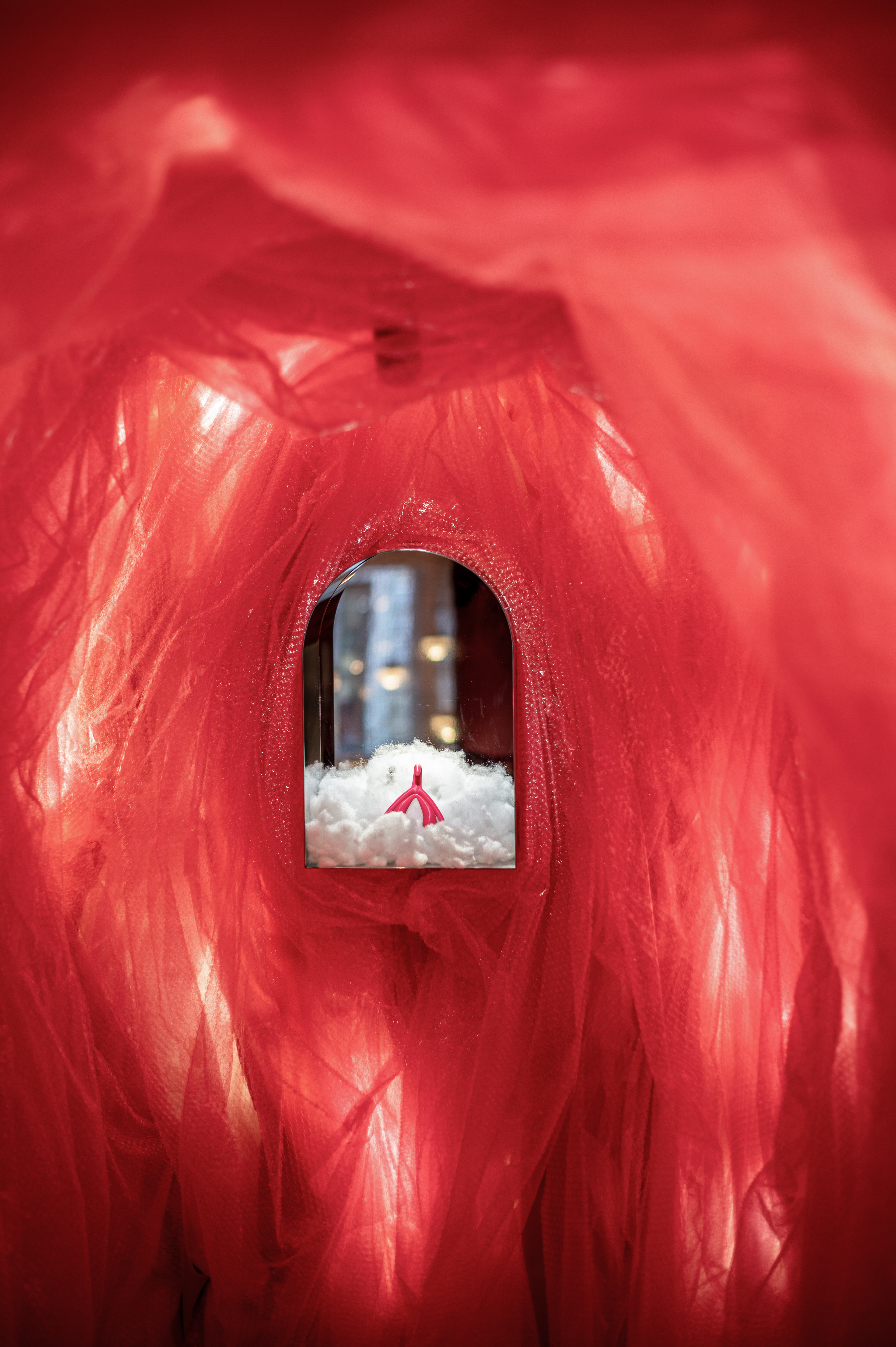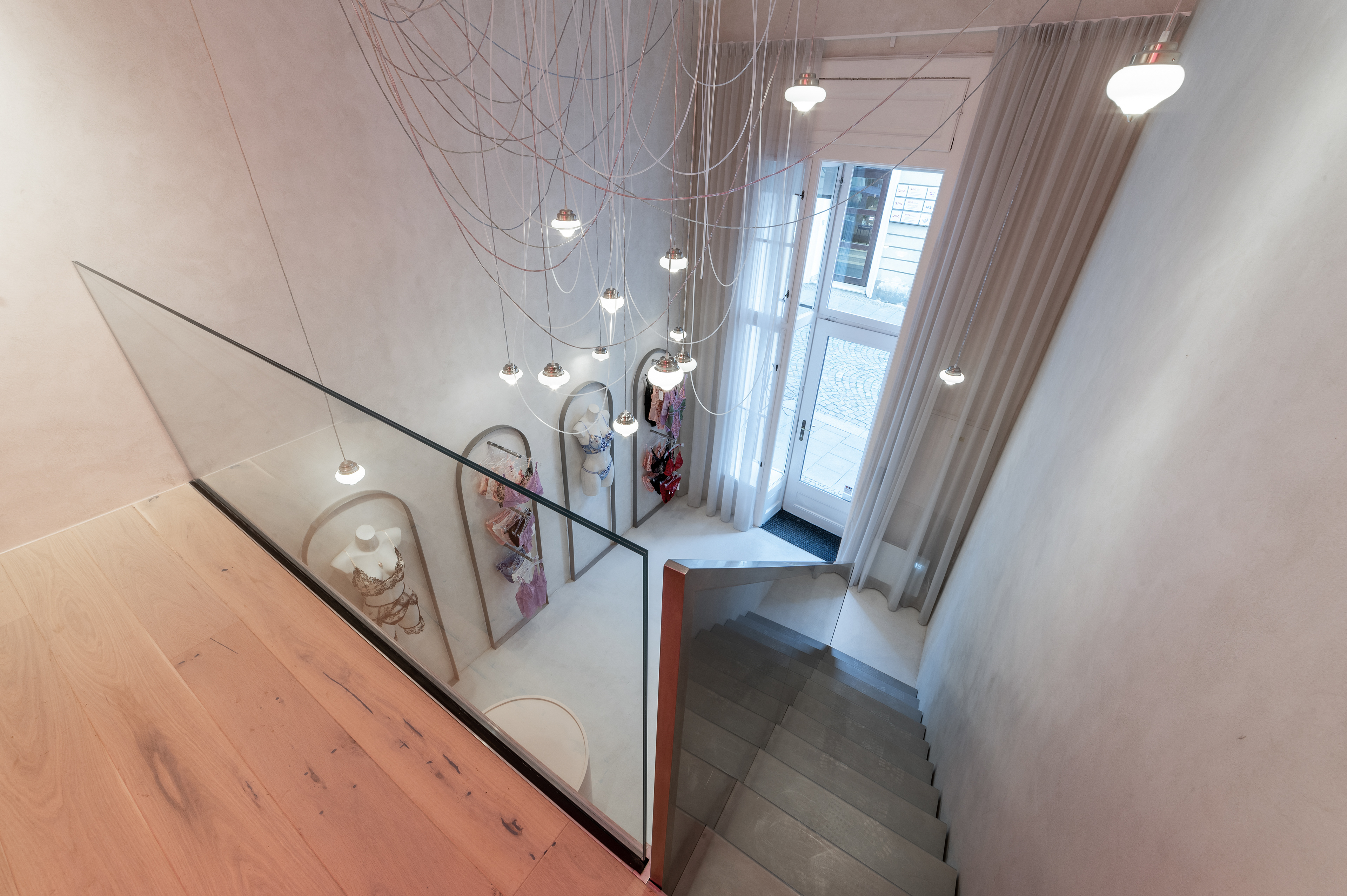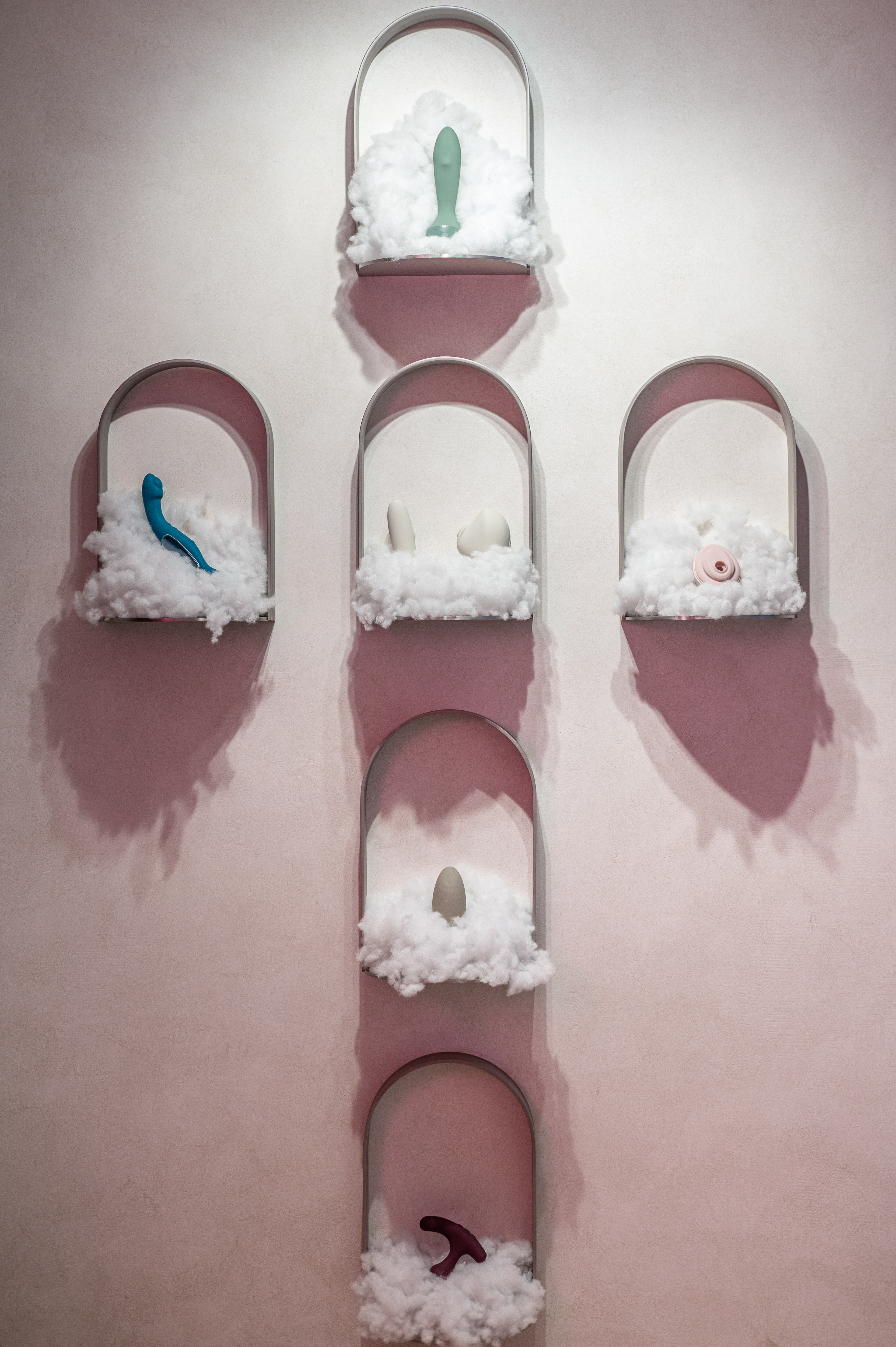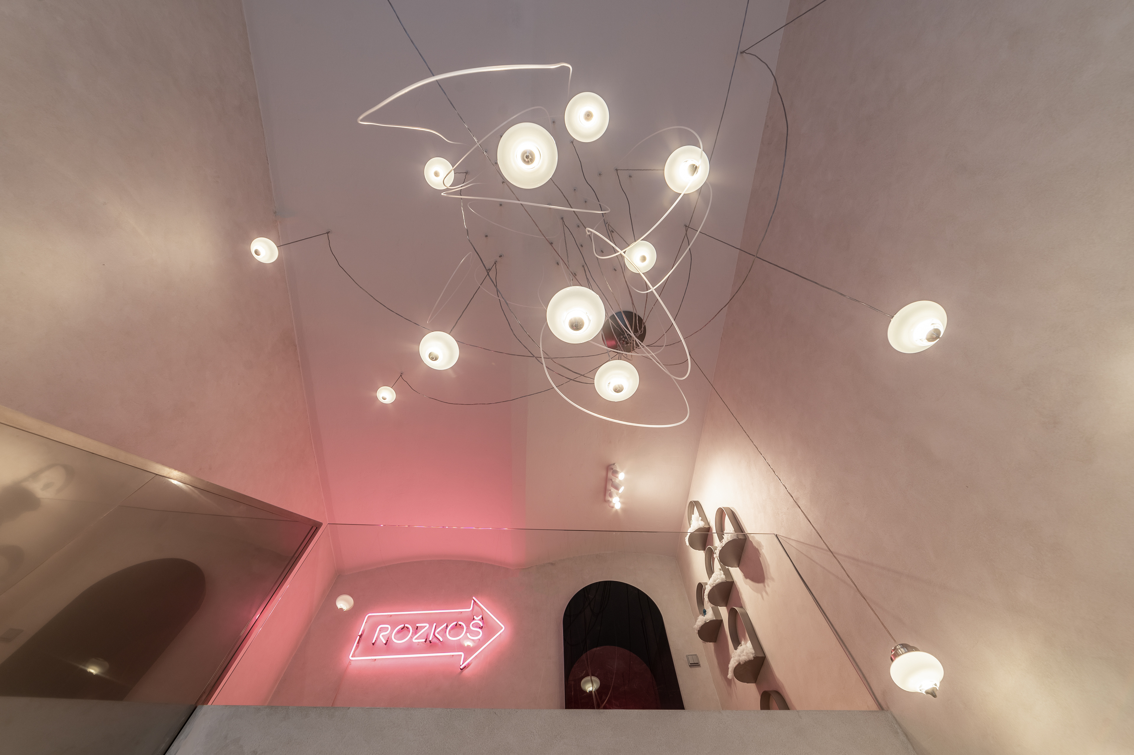 Interiér butiku s rozkoší. Lingerie, designové erotické hračky, hravost, intimita. Vkusný interiér s překvapením.