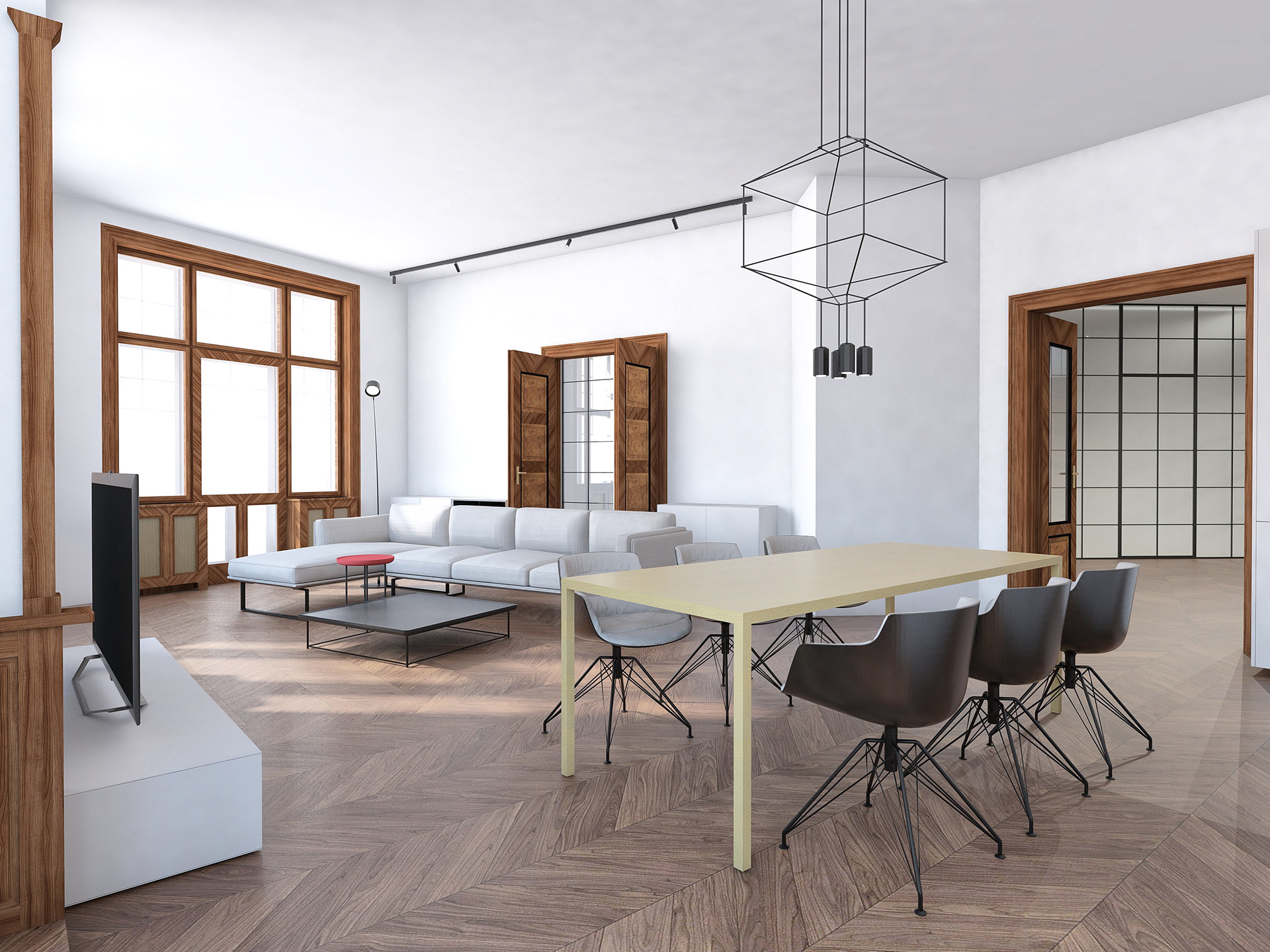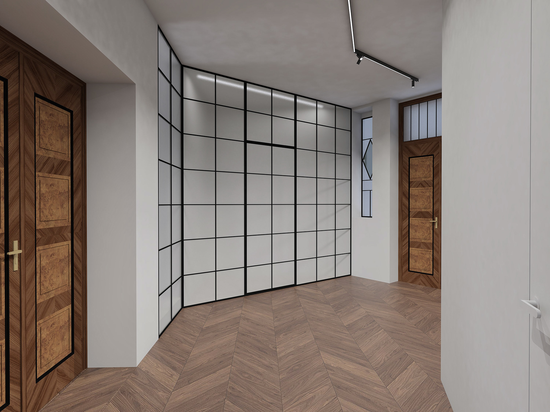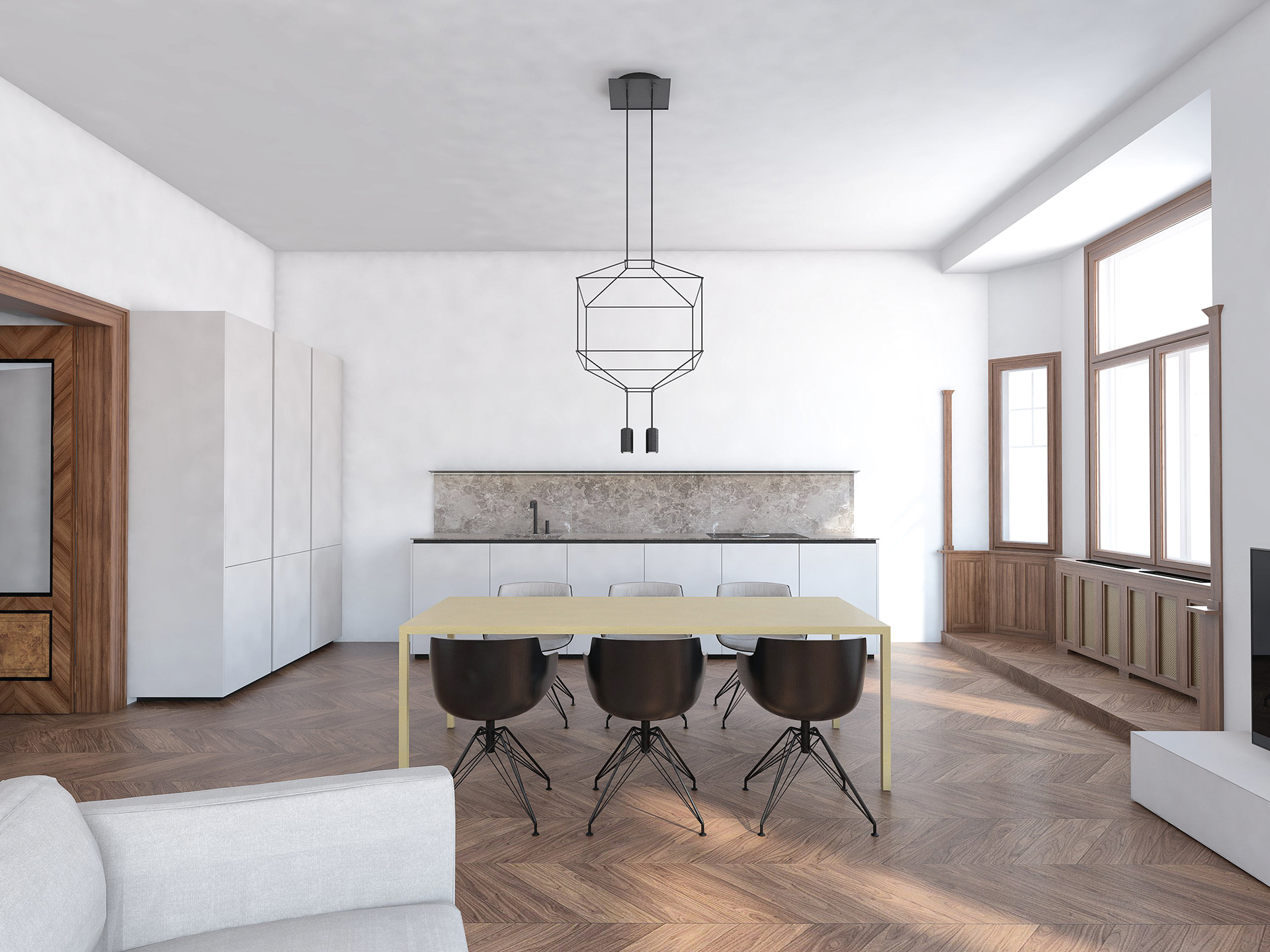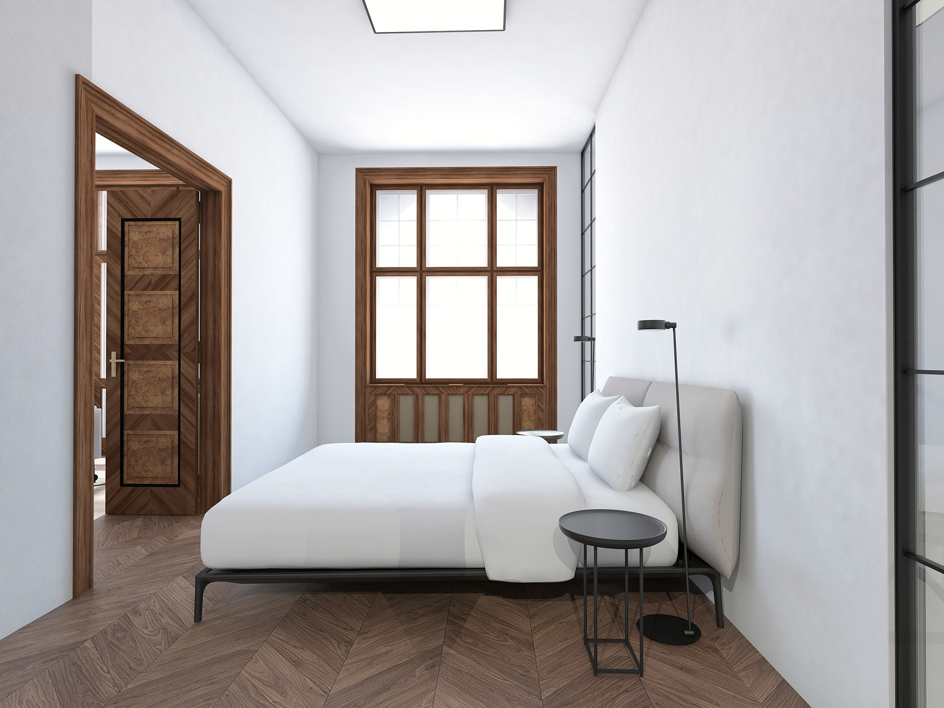 Studie bytu na pražském Josefově. Minimalistický interiér doplňuje výrazné původní historické prvky - okna a dveře.