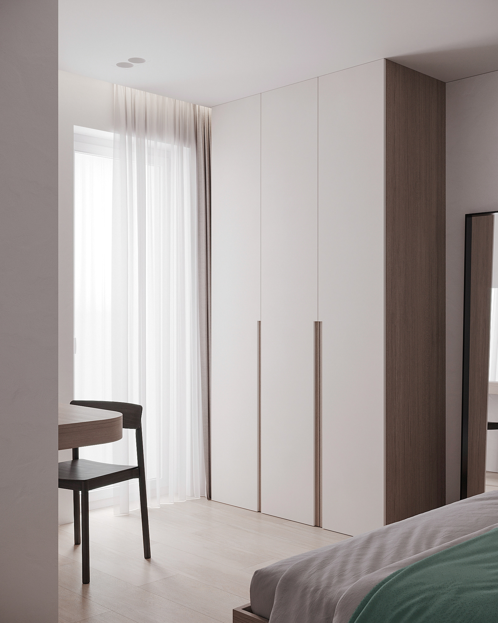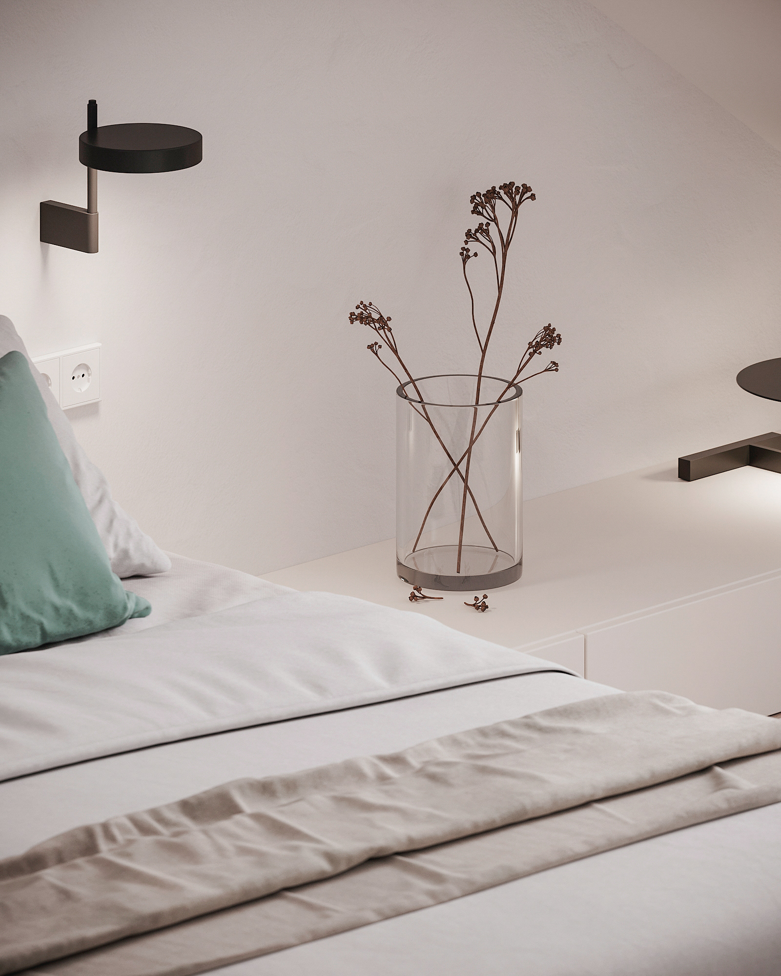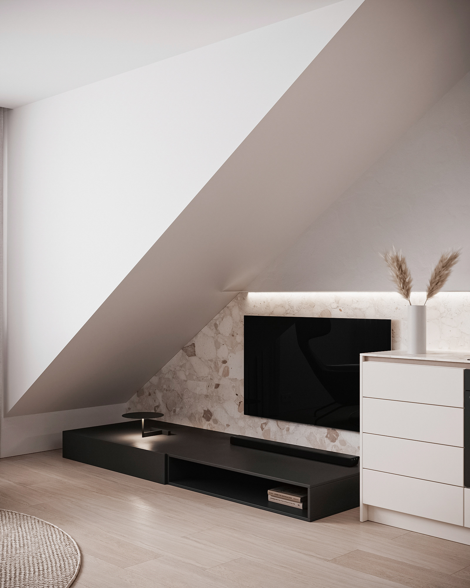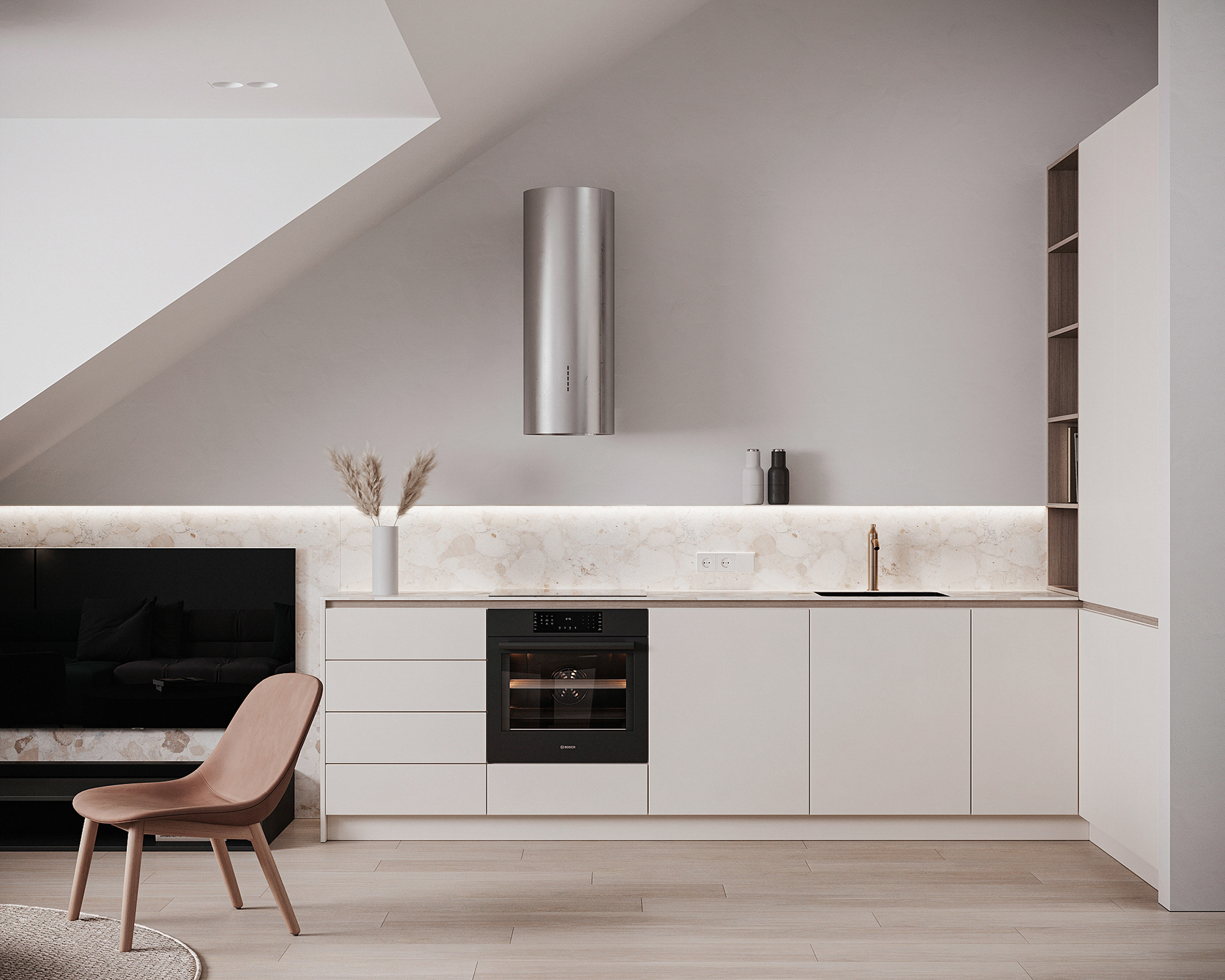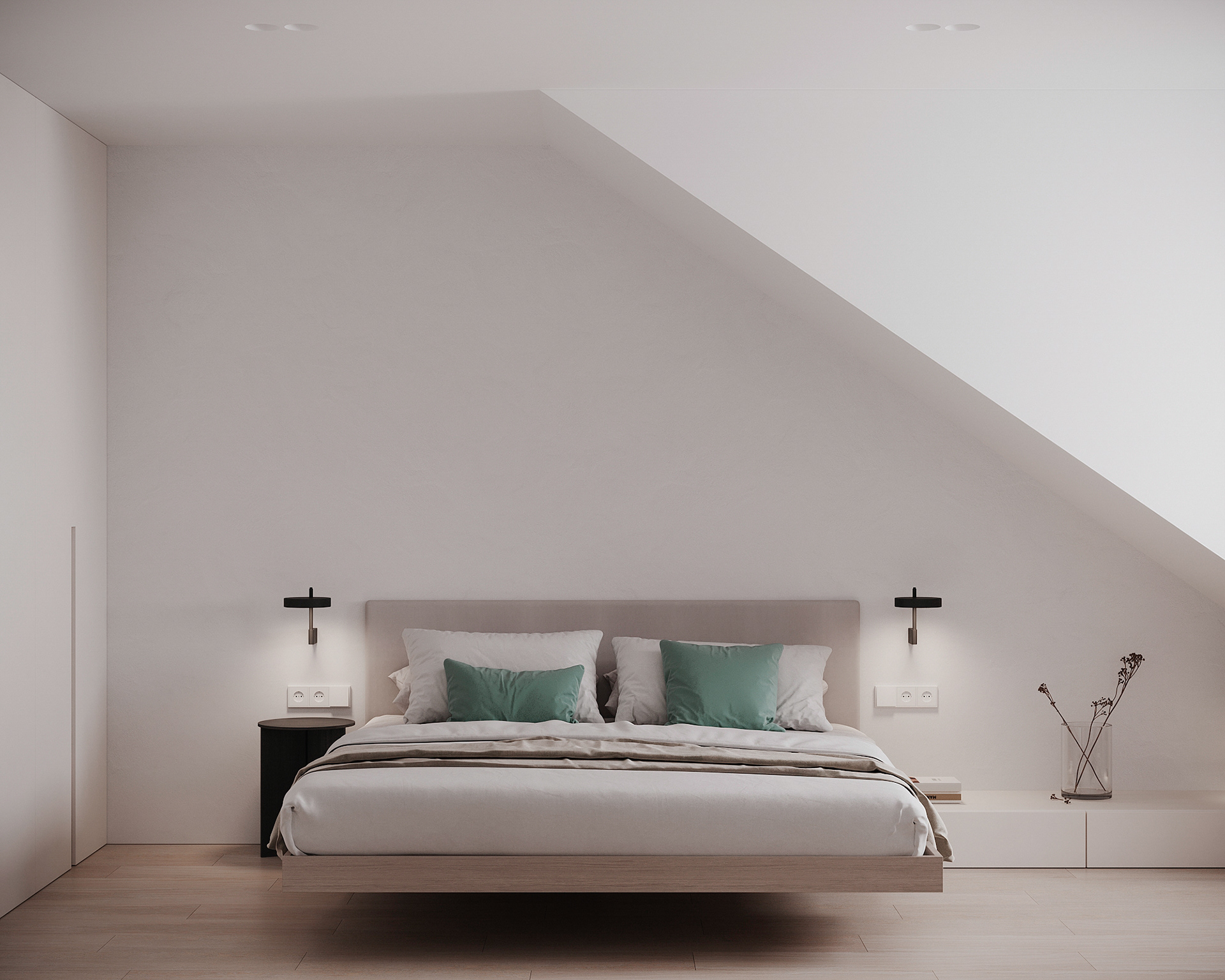Návrh interiérů třech developerských podkrovních bytů s různými dispozicemi, ve stejném designu.