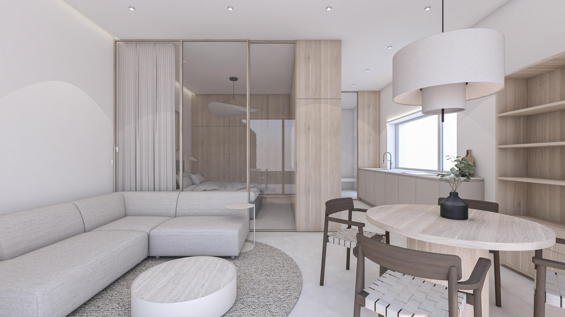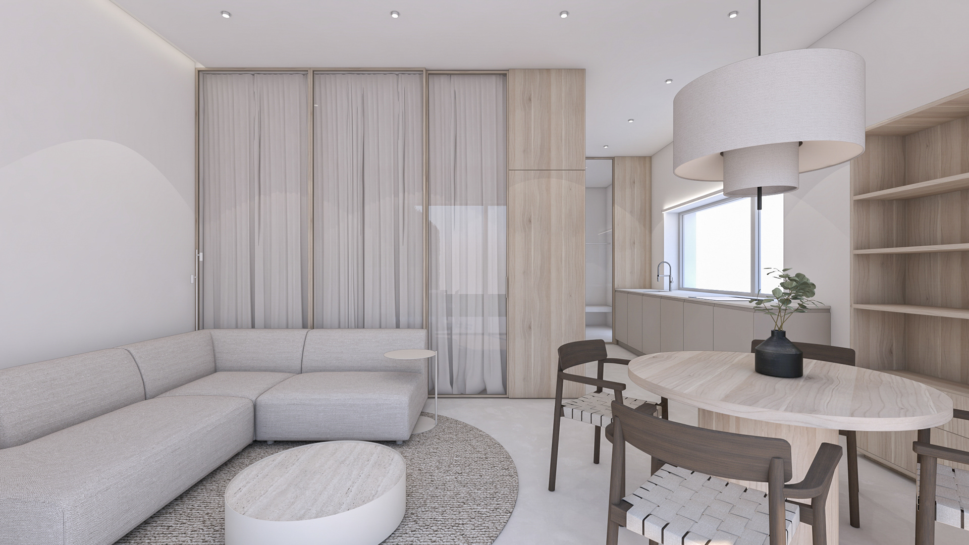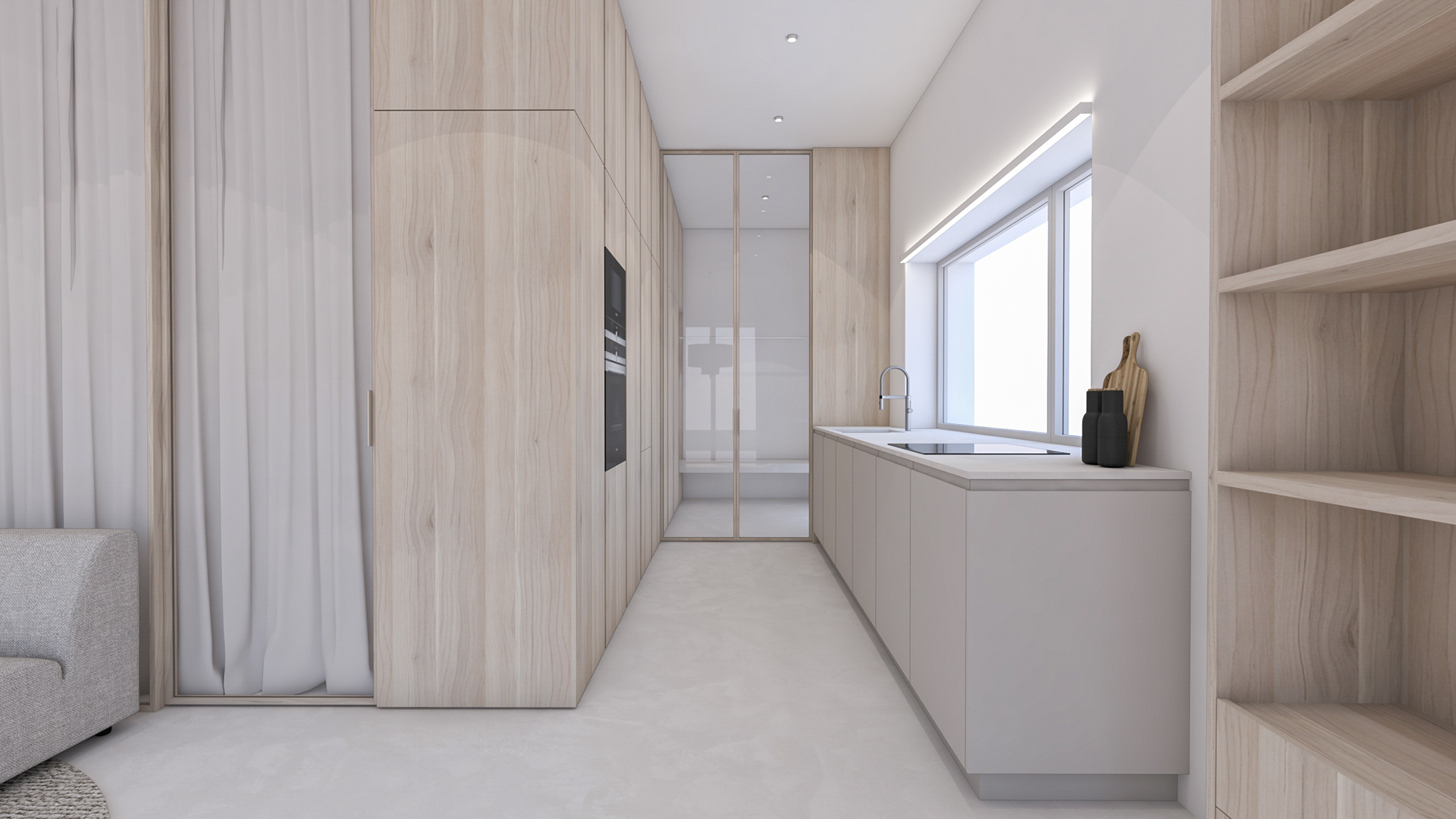 Interiér přízemního bungalovu ve vnitrobloku bytových domů. Celková rekonstrukce původního objektu, pravděpodně dílny.