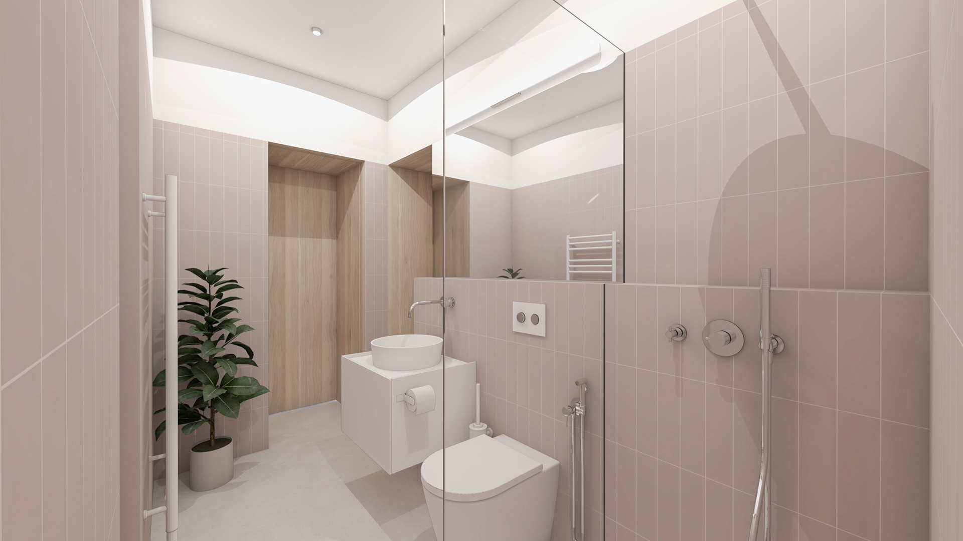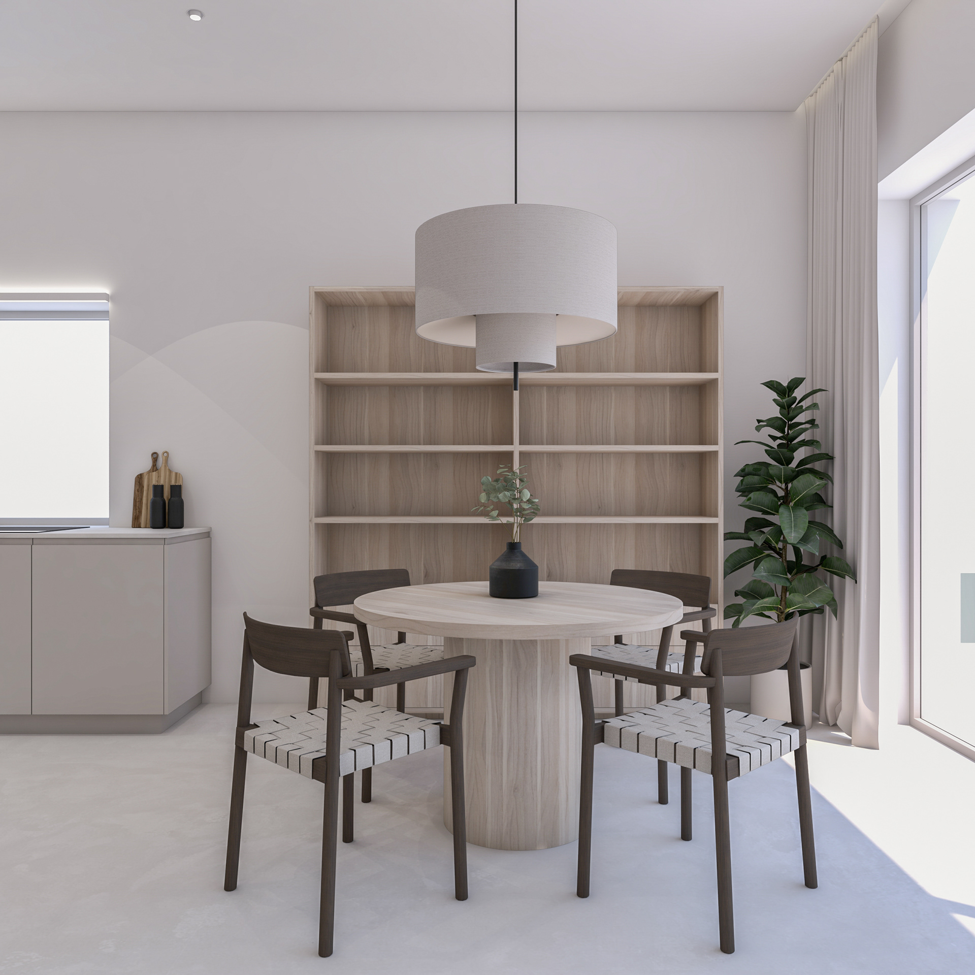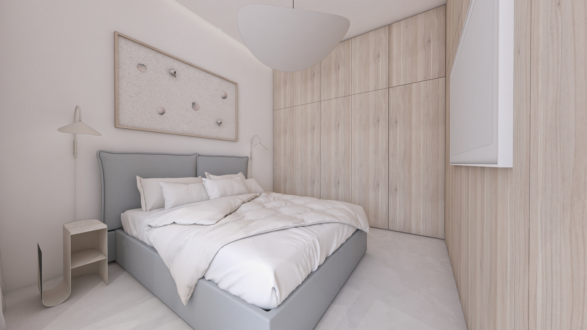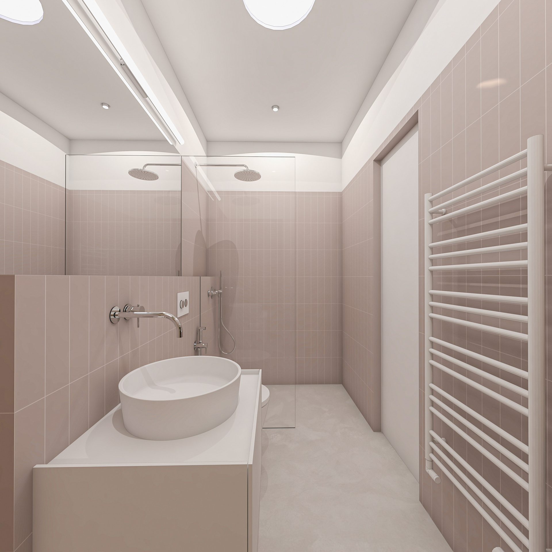 Interiér přízemního bungalovu ve vnitrobloku bytových domů. Celková rekonstrukce původního objektu, pravděpodně dílny.